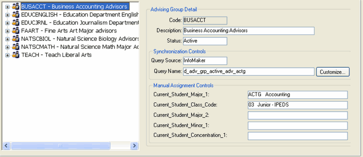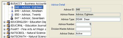 When you select an Advising Group in the Tree, detail information for that Advising Group is displayed.