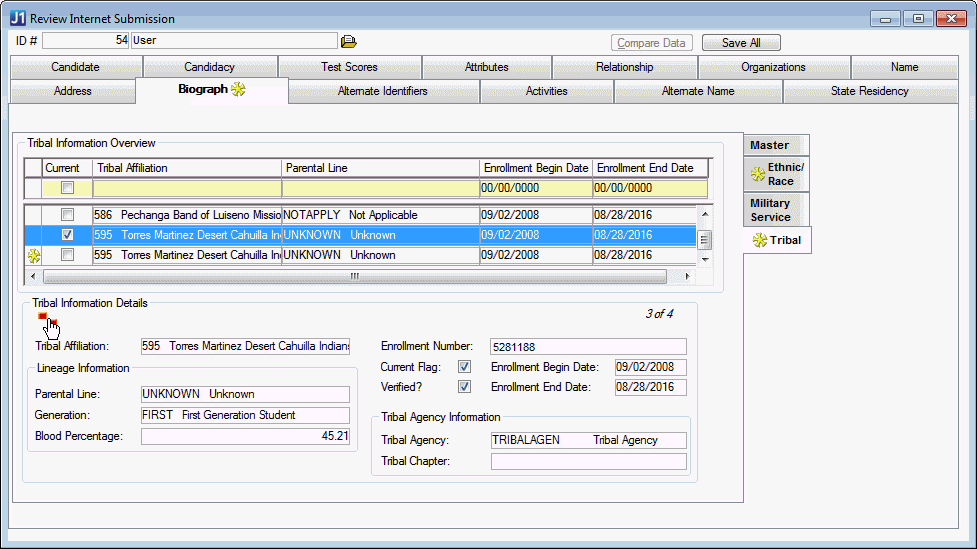 When the submitted data row is selected, the submitted values will appear in the Tribal Information Details box.