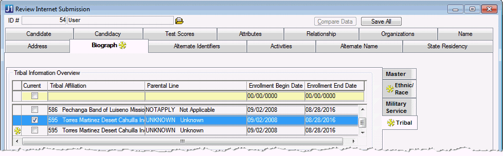 1. From the Review Internet Submissions window, click on the Biograph tab. A list of subtabs will appear to the right of the form.