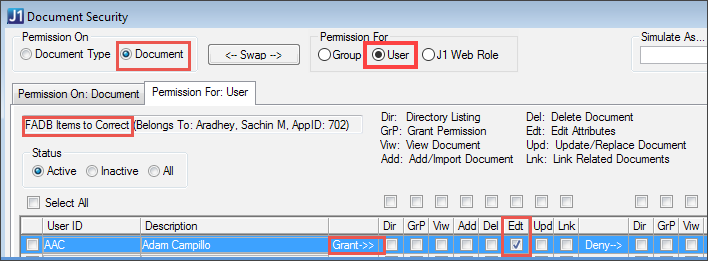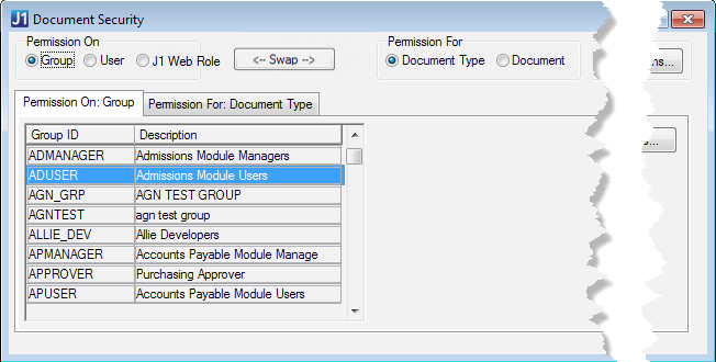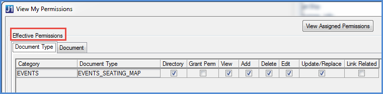 You can grant a user permissions for a particular document or for every document of a particular type. Users might also have permission because they are in a group or a J1 Web role that has permission.
