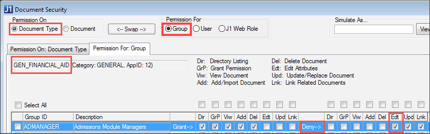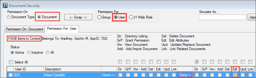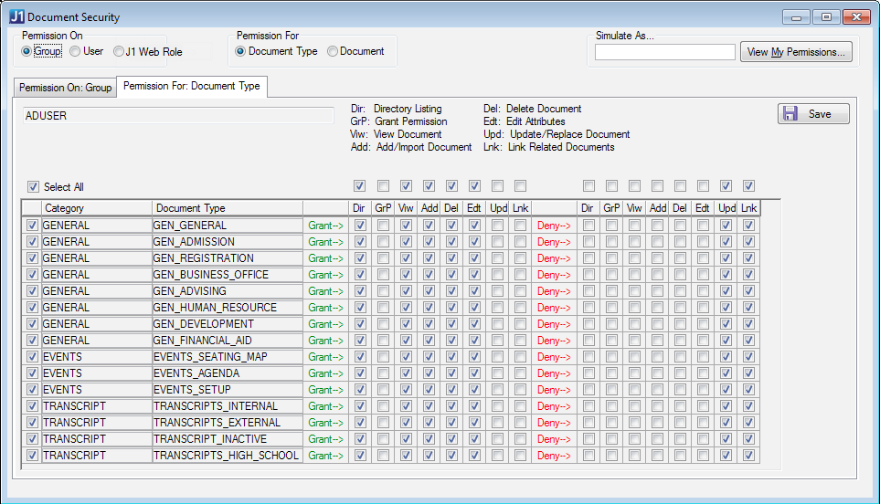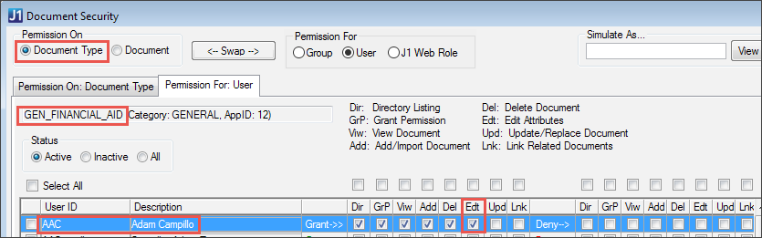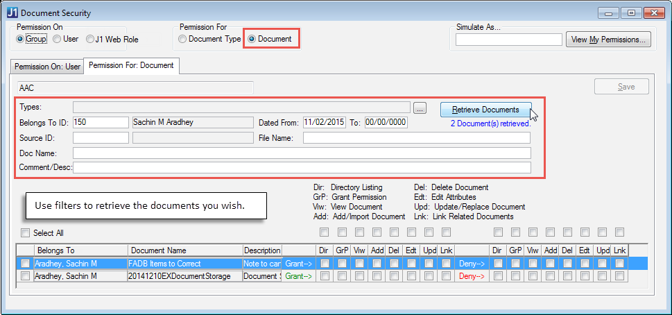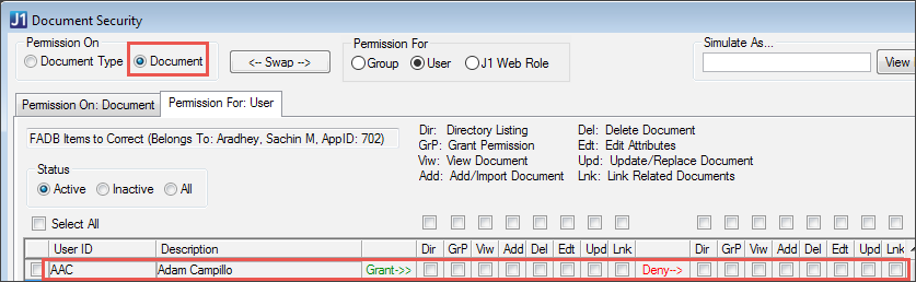 When you're logged in as the Document Storage Administrator, you can simulate the window as any J1 Desktop group, J1 Web role, or active user of J1 Desktop or J1 Web. That way, you can quickly view permissions that the user, group, or role has.