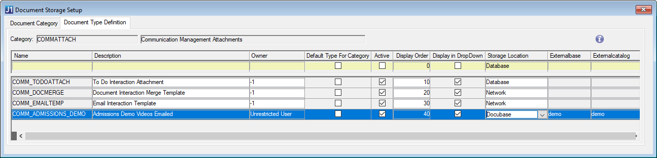 Use this tab to Here you define manage various types for each document category. You must define at least one document type for each category you wish want to use. You can create and delete types, activate and deactivate them, and you can make one type the default for each category, configure their display order in drop-down lists, and determine where the files will be stored. Externalbase and Externalcatalog will show the default database and catalog associated with a selected third-party provider.