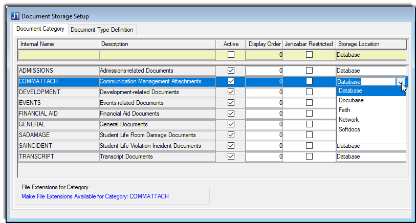 Use this window to manage document categories, types, and allowed file types and sizes for Desktop and J1 Web. Each category can have several document types. For example, the Transcript category could have High School, Transfer, and Internal types.