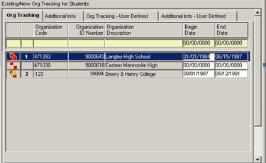 The existing organization information in the J1 database is displayed on the Org Tracking, Additional Info, Org Tracking - User Defined, and Additional Info - User Defined sub-tabs in the Existing/New Org Tracking for Students. Example.