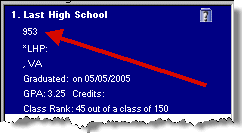 The Submitted Organization Info can display the following submitted information (read only) for the organization: submitted organization type and code, the appropriate status icon, name, assigned ID Number, address, start and end date information, graduation information, degree information, GPA/credit information, and class size/rank information. Example. This information comes from questions mapped to the Organization Tracking logical mapping table. Each row mapped to the Organization Tracking table contains data entered by the user. If the Last High School column for a particular mapping is set to 'Y', the grouping has a "Last High School" header. If the Last Organization column = 'Y', the heading is "Last Organization". Any other organization has a header of "Other Organization".