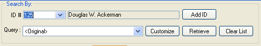 The header of the window allows you to search by ID # or Query and to work with the query results.