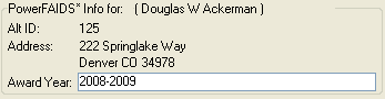 In order to view information on this window, you must have a connection to the PowerFAIDS database using the PF Database Profile set in the PowerFAIDS Database Connection window. The ID Number controls J1 data display, and the SSN controls PowerFAIDS data display. The default candidacy is the current candidacy. |