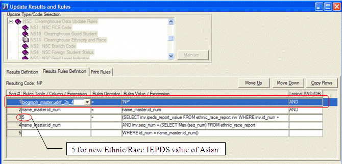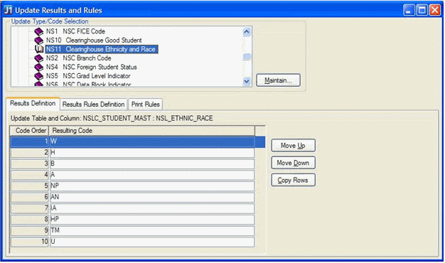 The sample window above details the NS4 Clearinghouse Foreign Student Update Rule. There are two table and column combinations that are currently being used to produce the results for this rule as explained in further detail below.