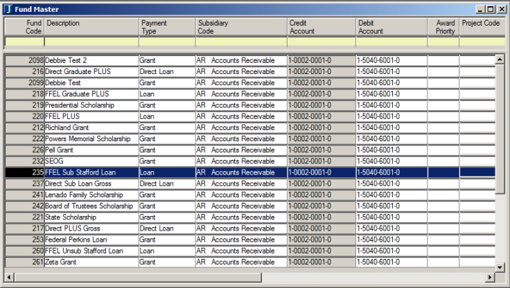 The Fund Codes shown in the Fund Master window (see above) must map to the Funds Ledger Number in PowerFAIDS. Fund Code 235, the Federal Subsidized Stafford Loan, is used in this example.