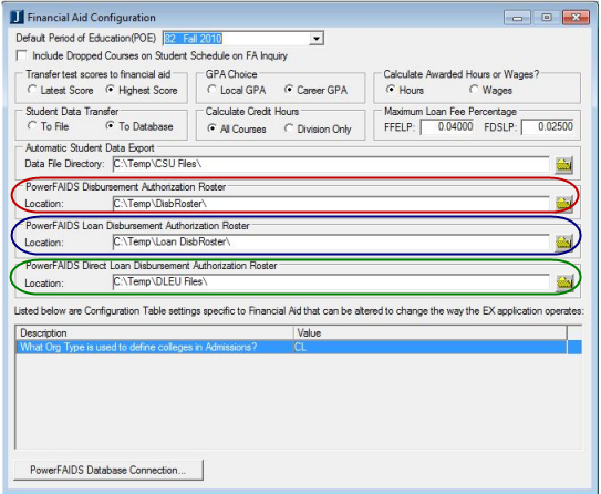 All Disbursement Processing tasks require a direct connection to the PowerFAIDS database in order to determine what records in PowerFAIDS to select for processing based on the selected POE. This will require that a database connection be established in the Financial Aid Configuration table. See Connecting to PowerFAIDS from J1 for full details.