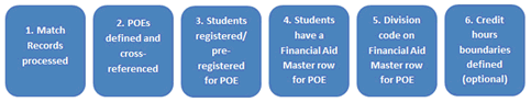 If you are using PowerFAIDS, the credit hours update begins by identifying all students assigned the selected POE and then either inserting or updating a Financial Aid Master row for them. It assigns their student division in Financial Aid Master based on their current student division found in the Student Master table when inserting a row or updating a student with a missing student division.