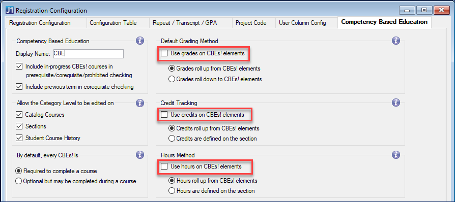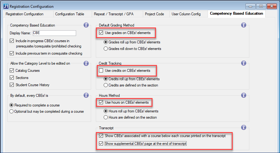 Use this tab of the Registration Configuration window to configure settings for the Competency Based Education.