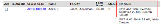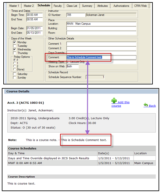 The Note column displayed on the Course Details screen in campus portal (JICS) can be supplemented by using the Comment column [SECTION_MASTER.COMMENT_TXT (limit of 30 characters)] on the Schedule tab.