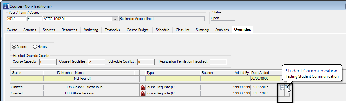 If your school has J1 Web Overrides turned on, then two more columns appear.