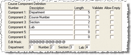 This window allows you to view and edit course component values, which you must have if you are selecting the Validate checkboxes in the Registration Configuration window where you define how the course code is constructed.