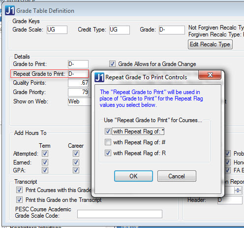 This is a pop-up window from the Grade Table Definition window where it governs the Repeat Grade to Print column. Use this pop-up to determine which repeat flags trigger the Repeat Grade to Print value rather than the Grade to Print value to appear in reports and transcripts.