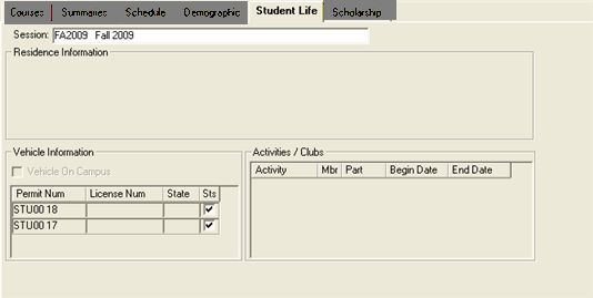 The Student Life tab displays information from the STUD_SESS_ASSIGN and SESS_ACT_MASTER tables in Student Life and the CM_SA_VEHCL_REG table. You can only edit the information displayed in Student Life using the Maintain Session Students, Vehicle Registration Details, and Session Activities windows. The Student Life tab defaults to the current session, but you may select another in the Session drop-down list.