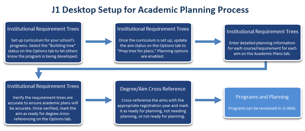 Trees outline what requirements need to be taken and J1 Web academic planning determines when those requirements can be taken. The plan created for a student is based on the student's selected aim and the required courses that meet that aim (built in the tree and requirements).