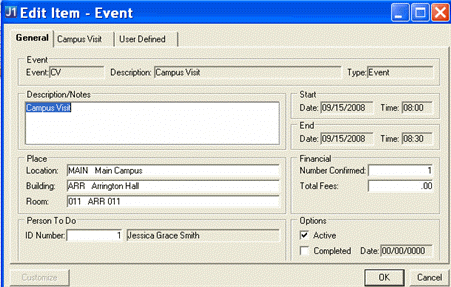 This button is only available if one or more Campus Visit rows are retrieved. After selecting a Campus Visit row, click this button to associate the selected Campus Visit row with the current Notepad event of the selected ID Number and the To Do List of the person responsible for this campus visit if defined. A row is immediately inserted and saved into the CAMPUS_VISIT_ITEM and CAMPUS_VISIT_ITEM_HISTORY tables upon clicking this button. Also, the information about the selected Campus Visit defaults to the following tabs: |