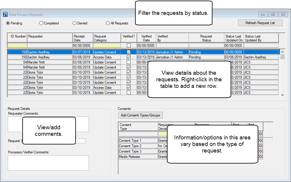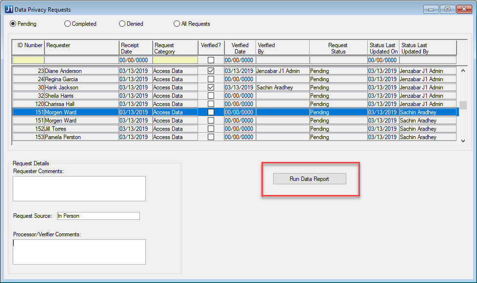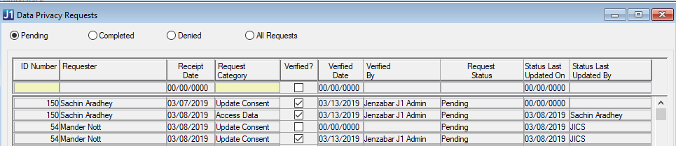 The Data Privacy Requests window displays data privacy requests submitted by users and other constituents whose data is stored in your system. The requests are shown in the order they were received, and the table is filtered to pending requests by default. You can also filter the list to view completed, denied, or all requests using the radio buttons at the top of the window.