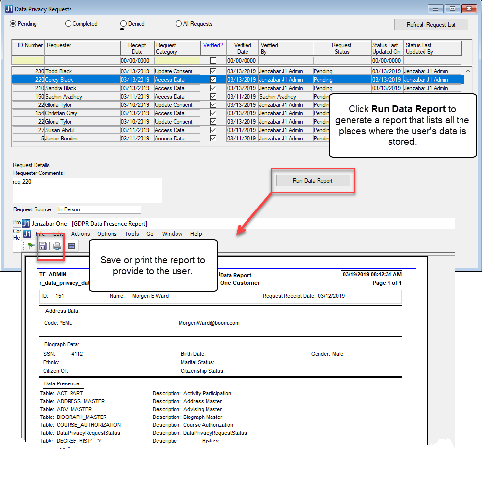 Individuals can submit a request to access the data your institution has on record for them. Upon selecting an Access Data request row, you have the option to run a report that indicates which database tables contain information about the person. You can then send the person a copy of this report. After running the report, the status for the selected Access Data request row is marked Completed, and the Status Last Updated On and Status Last Updated By fields are updated. If you are viewing only the pending requests, the currently selected request is removed from the list because its status is no longer pending. Example
