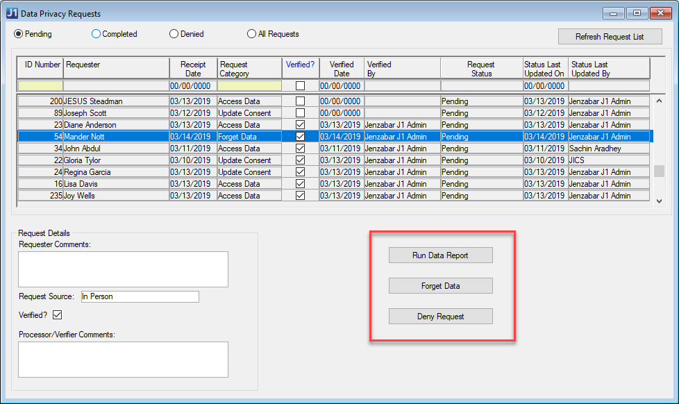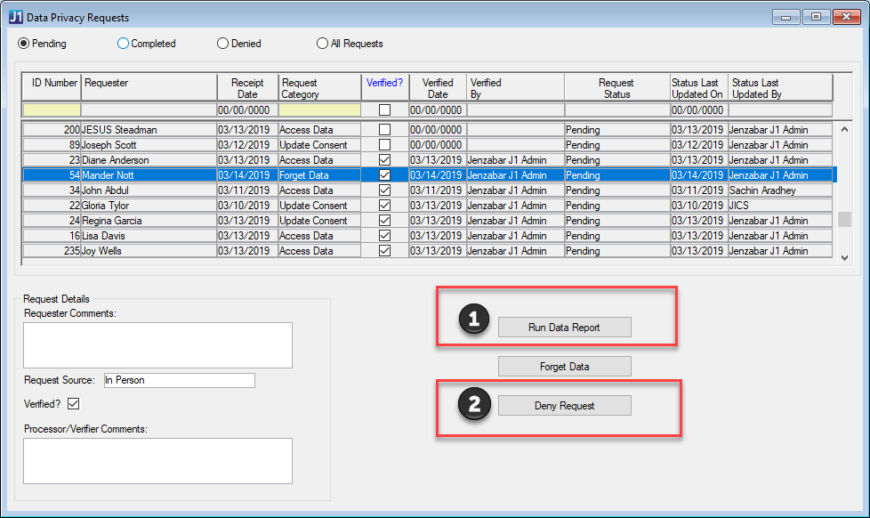 If an individual owes money to your institution or if you determine that the requester is not the person whose data is being requested, the Forget Data request should be denied. If a request will be denied, you may want to check the Verified? checkbox to indicate that you have done your due diligence in researching this request. You may also wish to enter and save notes in the Processor/Verifier Comments field as to why the request was denied prior to clicking the Forget Data request in case there is any question regarding the reason the request was denied. |