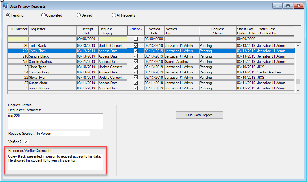 There should not be a need to verify an Access Data request prior to running the report for requests that have been submitted online since the requester would have been logged into the campus portal at the time of submission, and therefore it is most likely safe to assume that the person making the request is who he/she says they are. However, if a request is being made over the phone or in person, for example, you may want to ask for the person's ID or some other information to prove they are who they say they are before you provide them the Data Access report. In this scenario, you can check the Verified checkbox and add any desired Processor/Verifier Comments as documentation to indicate that a verification of their identify was done. |