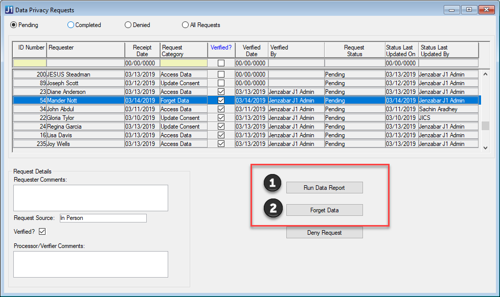 Upon completion of the process to forget a person's data, the status for the selected Forget Data request row will be marked Completed, and the Status Last Updated On and Status Last Updated By fields will be updated. If the Deny Request button is clicked, the selected Forget Data request will be marked Denied, and the Status Last Updated On and Status Last Updated By fields will be updated. In both of these scenarios, if you are viewing only the pending requests, the currently selected request will be removed from the list because its status will no longer be pending.