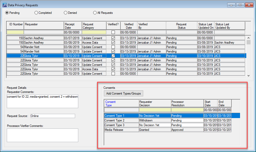 If a consent type is marked Withdrawn in the Decision column, the processor will have to do any appropriate research and then approve or deny the requester's decision. Typically, withdrawn consents should be approved. However, depending on what consent types you decide to collect and specific conditions in the person's data, there is the possibility that you may need to deny a withdrawn consent type. For example, if you have a consent type for 'Processing employment data' and a former employee withdraws their consent for processing their employment data, you may have grounds to deny the request if you have not yet processed their W-2 form for a year they were employed. In this case, notes should be added to the Verifier/Processor Comments field to indicate why the person's decision for the consent type was denied.