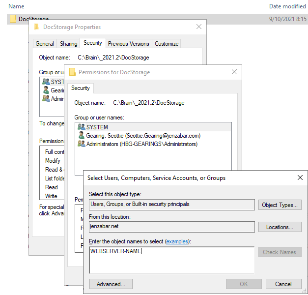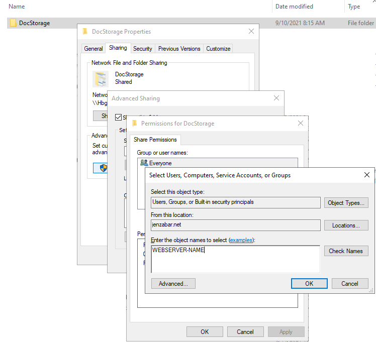 c. Confirm the environment running J1 Web has full permissions to the network location. The J1 Web machine name is used because J1 Web uses Document Storage and uses the same database as the Desktop.