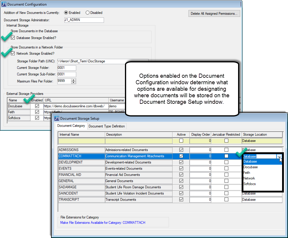 When you enable database and network storage, they become storage location options for document categories and types (Document Storage Setup window). Because J1 Desktop and J1 Web can have many files, consider impacts to your database and network. To optimize system performance, enable both options and store document categories in more than one location |
