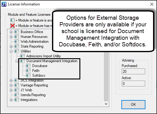 External storage options are only available if you are licensed with third-party providers Docubase, Feith, and/or Softdocs. To confirm your license, access the License Information window (from the Help menu, select About and click License Info).
