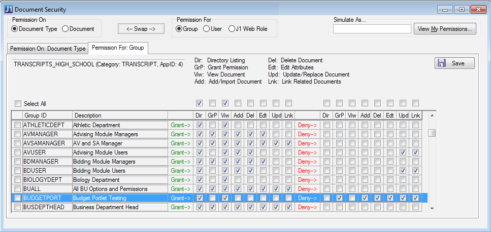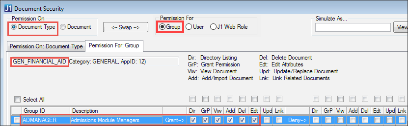When you're logged in as the Document Storage Administrator, you can simulate the window as any J1 Desktop group, J1 Web role, or active user of J1 Desktop or J1 Web. That way, you can quickly view permissions that the user, group, or role has.