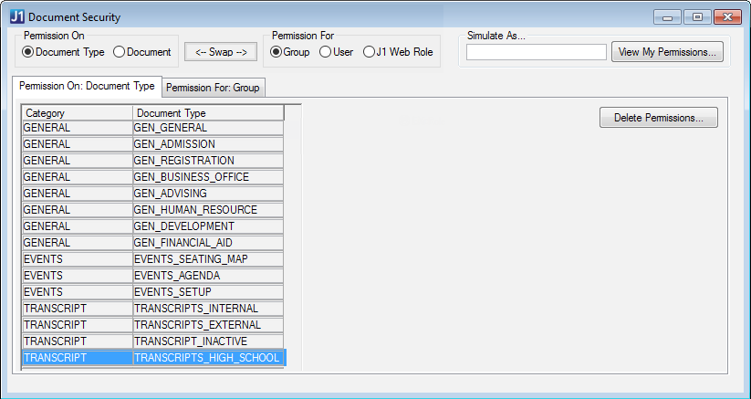Permission For: 'Document Type'.