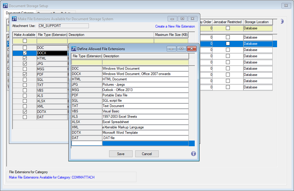 Use this window to manage document categories, types, and allowed file types and sizes for Desktop and J1 Web. Each category can have several document types. For example, the Transcript category could have High School, Transfer, and Internal types.