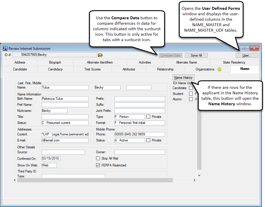 This tab is always displayed and is used to review any information that is included in a submission that needs to be saved to the Name Master table.