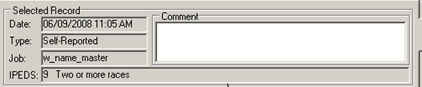 The following read-only columns are displayed for the selected record in the Ethnic/Race Records group box. The USER_NAME, JOB_NAME, and JOB_TIME are only updated when a row is created.