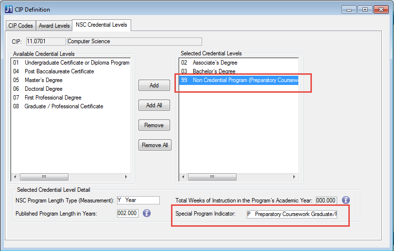 You must select the Used in Regulatory Reporting checkbox for each CIP code for which the U. S. Department of Education requires you to report statistics. Each major or certification offered by your institution must be associated with a CIP Code, as this association is needed by IPEDS Fall Enrollment and Completions reporting and for National Student Clearinghouse (NSC) programs. |