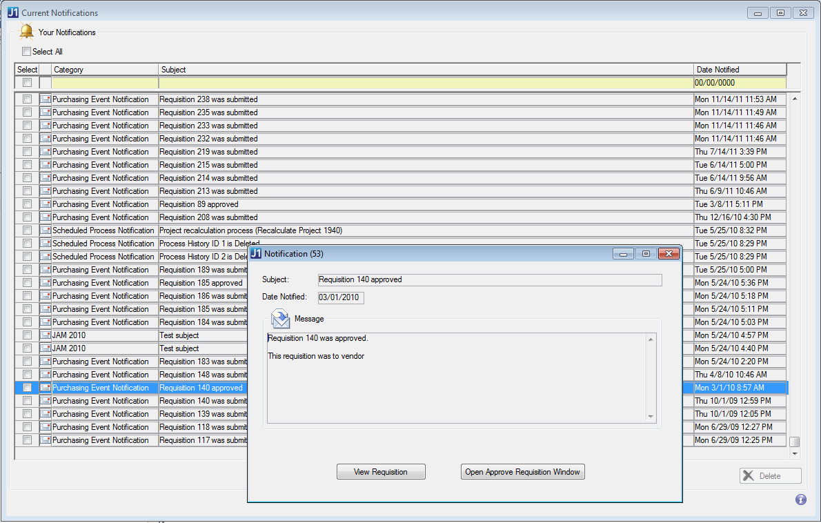 Notifications area of My Workspace. Click on the notification to view information and to access the application log associated with this Daily Procedure run.
