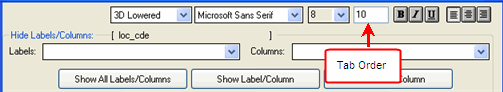· Tab Order Columns can be determined by assigning tab order numbers. Columns can be tab ordered in increments of 10. For example, the tab order for ID Num, Last Name, and First Name was determined by assigning the tab order number of 10 to ID Num, 20 to Last Name, and 30 to First Name.