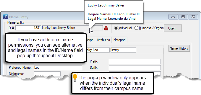 Users with the appropriate permissions can view and manage legal name information. To view legal names, hover over the name field. If the legal and campus names differ, you'll see a pop-up window. Example