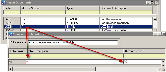 If you use EMAIL merge document type to send e-mail messages via Daily Procedure, the details of the sending of those e-mail messages are recorded in the J1 Desktop Application Log. If you want to view details about those e-mail messages in the Application Log File window, you must have a valid J1 Desktop module code associated with the Notepad module codes. Therefore, if you use customized module code values and you use the EMAIL merge document type, you should associate a valid J1 Desktop module code (AD, AP, AR, AV, BG, BU, CM, DE, FX, GL, HR, PA, PE, PF, PO, RE, SA) to the customized module code values. To do so, enter one of these J1 Desktop module codes in the Alternate Value 1 column on the Maintain Table Values window for the access_to_module column name. If the Daily Procedure process cannot find a standard J1 Desktop module code that is associated with the module code of the e-mail document definition, the CM module code will be used.