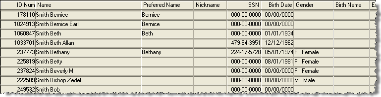 If you select a row and click the OK button, the Name Search window closes and the ID Number for the selected row is returned to the window from which you initiated the name search.