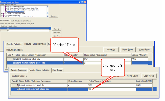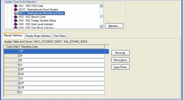 You should define rules for PFD, PFN, and PFS only if you have selected the Use Rules Based Update for PT/FT Definition checkbox or the Use Rules Based Update for NSC PT/FT Definition checkbox on the Registration Configuration window. The following suggestions and examples have been provided to assist you in defining the results and rules for the five (5) NSC update types and codes that are available. Although Jenzabar provides you with the update type and code combinations for NSC, Jenzabar has reserved the right for each client to identify the rules.