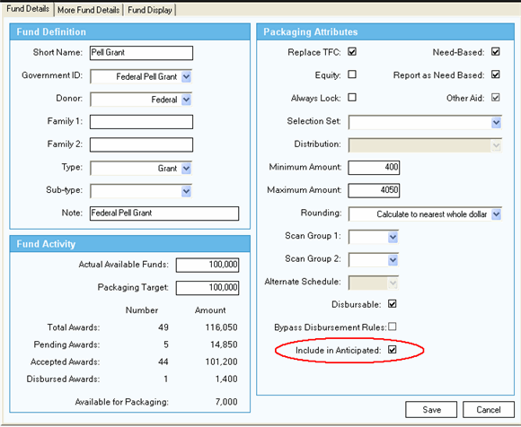 13. Select Include in Anticipated check box in eligible PowerFAIDS funds.