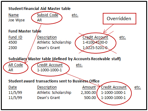 Joe Student received two awards with differing credit accounts specified on the Fund Master table. By specifying a subsidiary code (AR) for Joe, both awards are credited to the subsidiary's credit account rather than to the credit accounts on the Fund Master table (illustration).