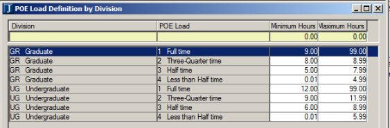 This window allows you to define and maintain POE Loads that are used by PowerFAIDS. You can enter minimum and maximum credit hour ranges for each of the four POE Load codes used by PowerFAIDS based on the division of the student.