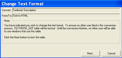 When a different text format is selected, data in TEXTBOOK_DEF.BOOK_DESC table is converted to the newly selected text format.