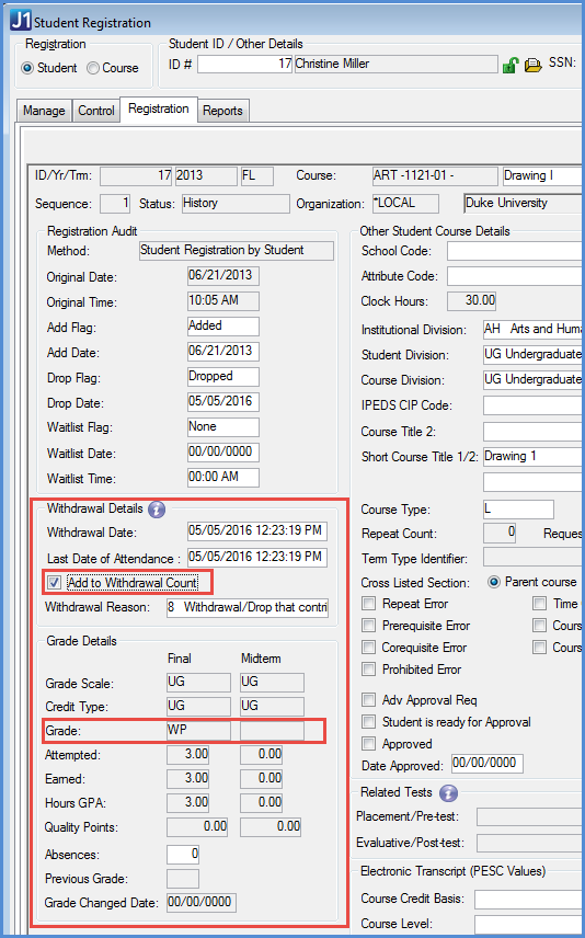 § The grade is defined as a Withdrawal Grade (in the Grade Table Definition window).