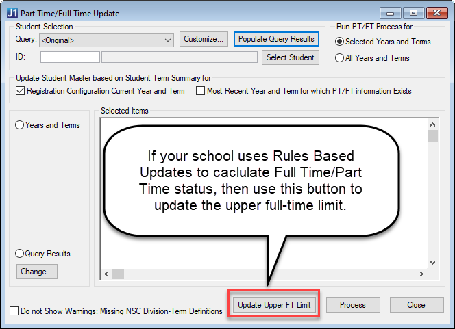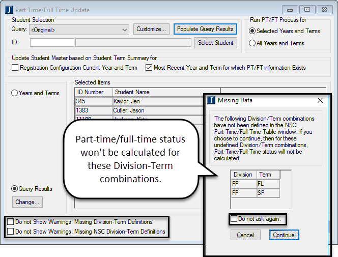 If you try to run the update process for a term that doesn't have a division definition, a message tells you which division/term combination needs to be defined. Use the Part-Time/Full-Time Definition window. If you don't need to define the combination—because it's a transfer term, for example, you can select a Do Not Show checkbox. Example